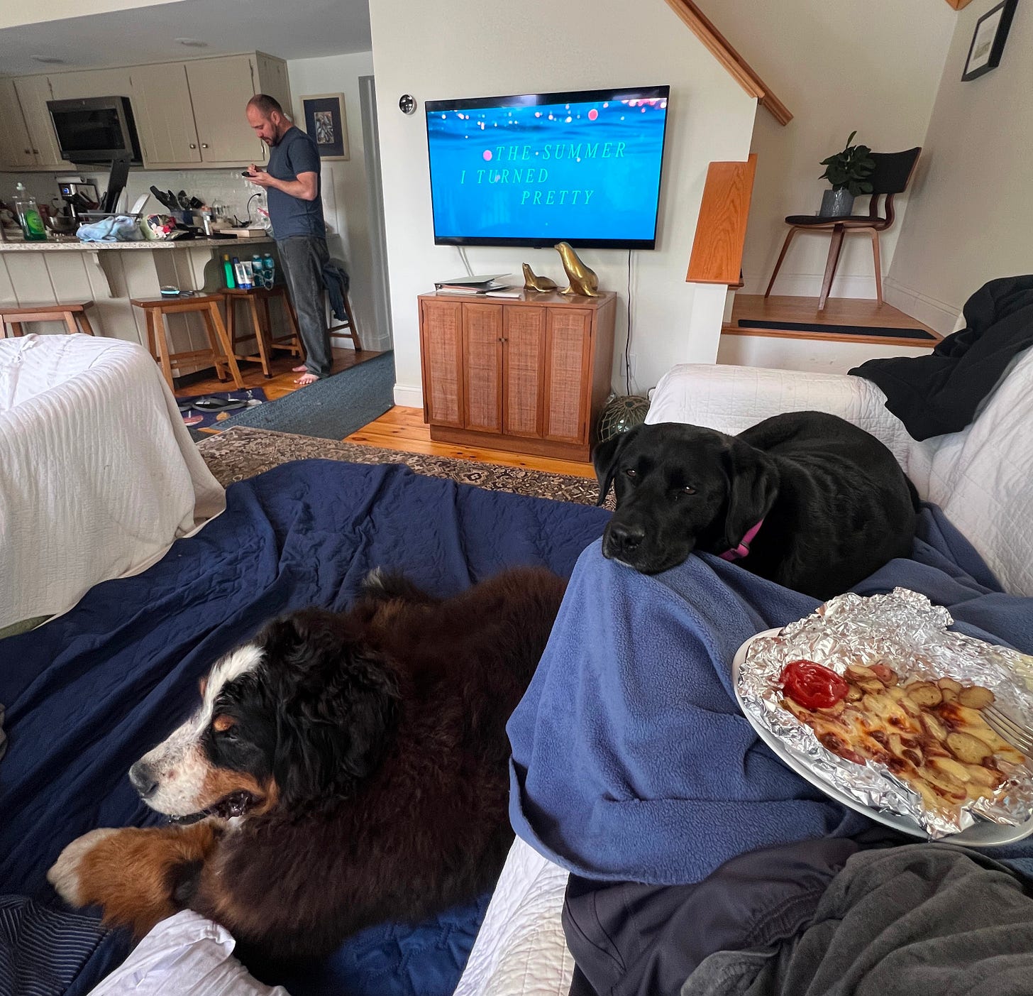 Instead, it’s snuggling Waffle and Tug for three hours a night while rewatching The Summer I Turned Pretty over and over again (team Conrad for life). It’s turning my camera off and dork dancing in the middle of zoom calls. It’s cancelling plans that overwhelm me for no explicit reason and throwing out every single one of my bras.